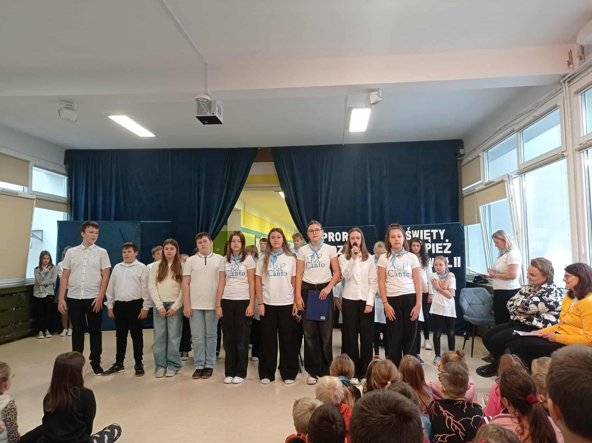 Prorok Nadziei - to hasło przyświecało tegorocznym obchodom tego święta. Uczniowie z klas V b i VII b oraz chór szkolny zaprezentowali montaż słowno-muzyczny i opowiedzieli historię życia Karola Wojtyły.