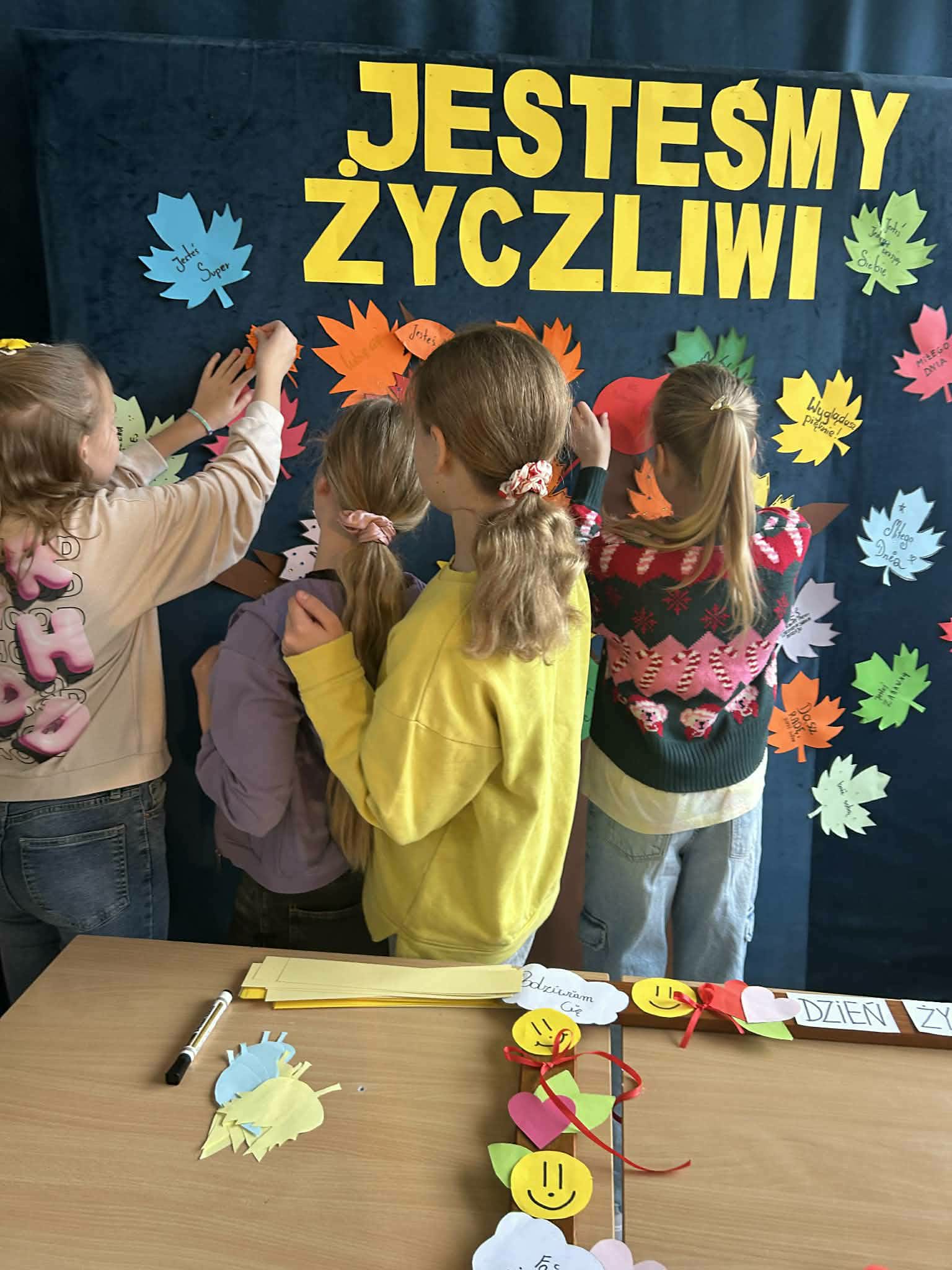 W ramach kolejnej aktywności powstało - Jesienne Drzewo Życzliwości. Uczniowie samodzielnie wykonywali listki z kolorowego papieru, na których zapisywali dobre słowa, życzenia, pozytywne hasła oraz krótkie motywujące zdania. Każdy listek był symbolicznym gestem dobroci. Wspólnie stworzone drzewo stało się piękną dekoracją szkolnego korytarza oraz dowodem na to, jak wielu uczniów chce budować atmosferę wsparcia i życzliwości.