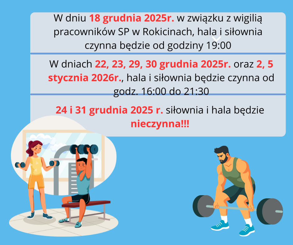 W dniu 18 grudnia 2025r. w związku z wigilią pracowników SP w Rokicinach, hala sportowa i siłownia czynna  będzie od godziny 19:00.